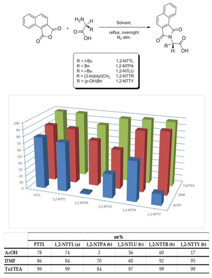 A mixture of 1,2-naphthalic anhydride (1.1 equiv.) and the L-amino acid (1 equiv.) in either anhydrous acetic acid, DMF or toluene/TEA (0.1 equiv.) was heated to reflux under nitrogen atmosphere overnight. After that time, the reaction was worked up according to one of the below procedures to afford the corresponding reaction product.