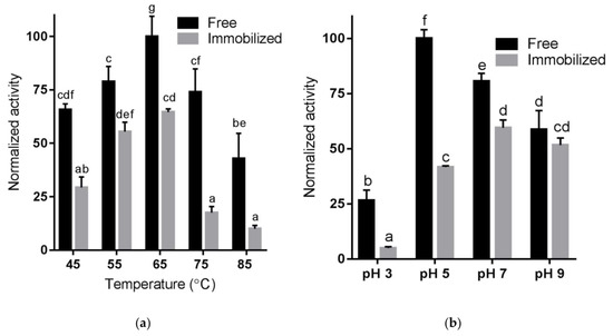 3.6. Effect of Immobilization on Enzyme Resilience to pH and Thermal Changes