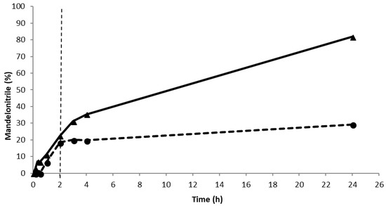 To check for possible leaching of the enzyme out of the enzyme package, 2 mandelonitrile synthesis reactions were performed in parallel. The only difference between the two reactions is that the enzyme package was removed from the reaction mixture after 2 h at approximately 20% conversion, whereas the enzyme package in the other reaction mixture remained present. The reaction conditions were PaHNL immobilized on 50 mg Celite R-633 (9.2 U/mg) packed according to method A, benzaldehyde (±106 mg, 1 mmol), HCN solution in MTBE (1.5 M), 1,3,5-triisopropylbenzene (±25 mg, internal standard), the stirring speed was 900 rpm, and the reaction was performed at room temperature. Small samples (10 µL) were taken at regular intervals and were analyzed as described below in the Section 4.6 analysis. For results, see Figure 2.