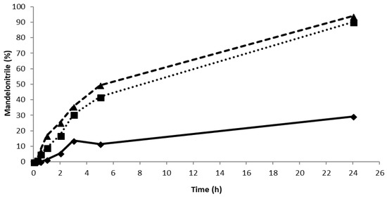Careful examination of the literature reveals that similar background reactions have been reported for Celite before [14,15,17] and that the best enantiopurity (ee ~ 97, albeit at only 37% conversion) was achieved when a high enzyme loading of 0.86 U PaHNL per mg of Celite was utilized [13]. In the other studies, the lower enzyme loadings were used because higher loadings yielded no advantage [14]. This indicates that different types of Celite were used in these studies. If the surface area of the carrier is smaller, full coverage will already occur at lower loading. In the initial study [14], only 0.65 U/mg of Celite was used, which represents an overload for the particular Celite used in that study. Already, at a ratio of 0.25 U/mg of Celite, no improvements in the rate were noticed, at 1 U/mg of Celite, a loss of the rate was reported, signifying the diffusional limitations in that case [14]. The experiments described here were performed with Celite R-633 that had been used successfully for the immobilization of other HNLs [16]. Preliminary experiments with Celite R-633 revealed that above 2.6 U/mg, no significant improvements in the rate were observed and that at 6.5 U/mg, the same rate and enantioselectivity (ee = 89%) were measured (Figure 3). Clearly, the type of Celite presented in this study is favorable for PaHNL immobilization, enabling good conditions to suppress the background reaction. To ensure this even further, the Celite R-633 was washed with 50 mM pH 5.4 citrate/phosphate buffer prior to immobilization. Furthermore, the PaHNL was either desalted prior to the lyophilization and immobilization, or the immobilized enzyme on Celite was washed extensively in buffer saturated MTBE.