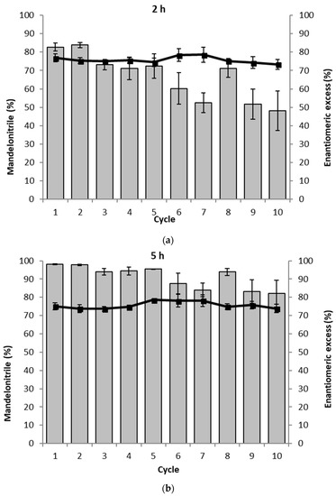 The recycling of the loosely packed PaHNL immobilized on Celite in ten successive mandelonitrile synthesis reactions. The assay was performed in duplo and the average of both results is shown. The gray bars represent the conversion to mandelonitrile (%) and ■ and the solid line represent the enantiomeric excess (%). Conditions: benzaldehyde (±106 mg, 1 mmol), 2 mL·HCN solution in MTBE (1.5 M), 1,3,5-triisopropylbenzene (±25 mg, internal standard) and a small, loosely packed teabag filled with the PaHNL immobilized on Celite R-633 (6.5 U/mg; 50 mg), stirred at 900 rpm at room temperature. (a) Results after 2 h; (b) Results after 5 h.