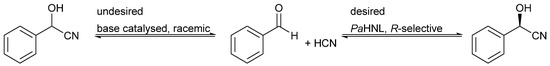 The PaHNL catalyzes the R-selective addition of HCN to benzaldehyde, yielding (R)-mandelonitrile; the base catalyzed and racemic reaction needs to be suppressed to achieve high enantiopurity.