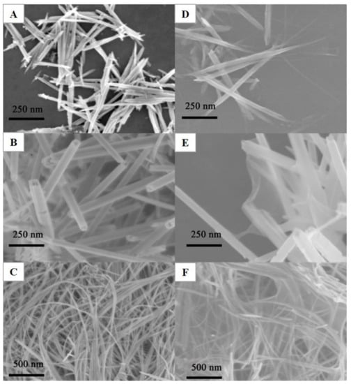 The scanning electron microscopy (SEM) images of MnO2 nanomaterials and corresponding MnO2-reduced graphene oxide (RGO) nanocomposites. (A): MnO2 nanorods (NRs); (B): MnO2 nanotubes (NTs); (C): MnO2 nanowires (NWs); (D): MnO2 NRs/RGO; (E): MnO2 NTs/RGO; (F): MnO2 NWs/RGO.