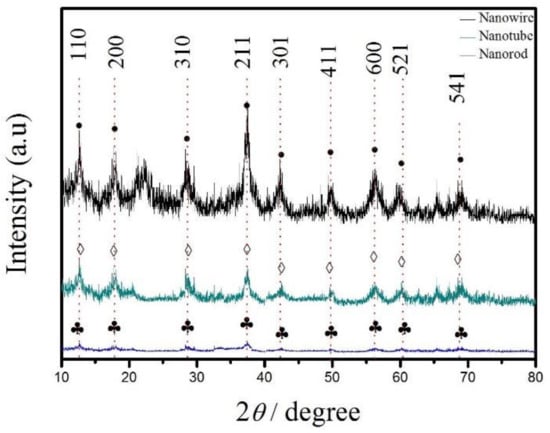 The MnO2 NRs, MnO2 NTs, and MnO2 NWs were further characterized by X-ray diffractometer (XRD, PANalytical, Almelo, Holland), operating at 40 kV and 40 mA with Cu Kα radiation (λ = 0.1542 nm). The XRD patterns of MnO2 NRs, MnO2 NTs, and MnO2 NWs are presented in Figure 2. All of the nano-MnO2 appears with obvious diffraction peaks. These diffraction peaks are located at 2θ of 12.78°, 17.68°, 28.28°, 37.48°, 42.36°, 49.94°, 56.34°, 60.16°, and 69.08°, indexing into (110), (200), (310), (211), (301), (411), (600), (521), and (541) facets (JSPDS44-0141), indicating that tetrahedral crystalline α-MnO2 was synthesized.