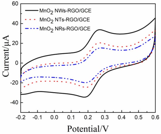 In order to compare the electrochemical active area of different electrodes, the cyclic voltammograms of the MnO2 NRs-RGO/GCE, MnO2 NTs-RGO/GCE, and MnO2 NWs-RGO/GCE were investigated in the 0.1 mol/L PBS solution containing 1 × 10−3 mol/L [Fe(CN)6]3−/4− (Figure 3). Their reduction peak currents (ipc) are 2.158 × 10−5 A, 1.738 × 10−5 A, and 1.375 × 10−5 A, respectively. According to Randles-Sevcik Equation []