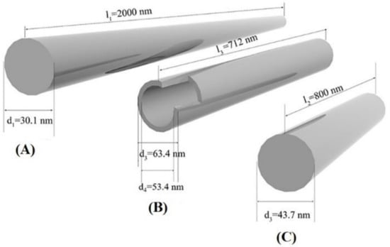 Nanorods and nanowires are generally distinguished by their length-to-diameter (l/d) ratio [,]. Nanomaterials with l/d ratio of 1–10, diameter (d) less than 100 nm, and length (l) less than 1000 nm are often defined as nanorods. Nanomaterials with l/d ratio greater than 10, d less than 100 nm, and l greater than 1000 nm are often referred as nanowires. Nanorods with a hollow structure and l/d ratio of about 1–10 are often called nanotubes. In order to investigate the specific surface area among different morphologies of nano-MnO2, cylinder models were proposed to simulate the MnO2 NWs, MnO2 NTs, and MnO2 NRs (Figure 4).