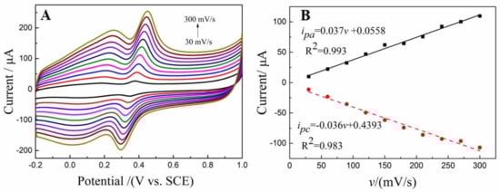 Cyclic voltammograms of 1 × 10−5 mol/L dopamine on the MnO2 NWs-RGO/GCE were recorded at various scanning rates, and the results are shown in Figure 5A. It is observed that a pair of redox peaks appear on the MnO2 NWs-RGO/GCE. With the increasing of scanning rates, the oxide peak currents shift toward a positive direction while the reduction peak currents shift negatively. In other words, the peak separation increases with the scanning speed, suggesting the electrochemical oxidation of dopamine on the MnO2 NWs-RGO/GCE is a quasi-reversible process. As presented in Figure 5B, the oxidation peak currents (ipa) increase linearly with scanning rate (v), suggesting the electrochemical oxidation of dopamine is an adsorption-controlled process. This result is consistent with previous reports [,,,,,], and also favors our assumption for model simulation.