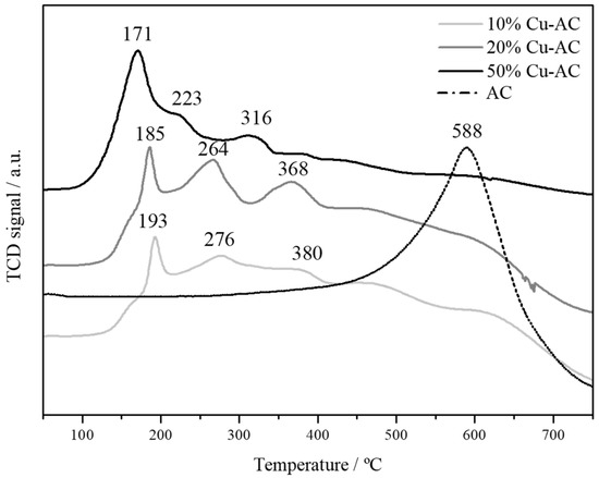 The TPR profiles of 50% Cu-AC, 20% Cu-AC, and 10% Cu-AC and the activated carbon support are shown in Figure 1. These TPR profiles result from the following sequential Cu reduction Cu2+ → Cu+ → Cu0 [20]. The first two reduction peaks at 171–193 °C and 223–276 °C (depending on the catalyst) can be attributed to the reduction of the more dispersed Cu particles and the reduction of CuO (II), respectively. The third reduction peak that appeared at 316–380 °C can be assigned to the reduction of Cu2O (I). Finally, the peaks at higher temperatures are typically associated with the gasification of activated carbon and the reduction of surface oxygenated groups on the activated carbon support [21,22]. The temperature of the most intense consumption peak (Tmax) is given in Table 1. The TPR profiles revealed that the interaction between the metal phase and the support varied depending on the metal particle size. Thus, stronger interactions were obtained for those catalysts having smaller Cu particles since Tmax decreased with the Cu particle size (Table 1) [20,23,24]. Thus, the reducibility of the catalysts followed the sequence: 50% Cu-AC > 20% Cu-AC > 10% Cu-AC. Furthermore, given the TPR profiles, 400 °C was selected as a suitable reduction temperature for ensuring complete metal activation while maintaining the surface properties of the support.