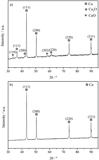 Figure 2 shows the XRD patterns of the powder catalyst 50% Cu-AC before and after the reduction treatment at 400 °C. No significant differences were appreciated between the three Cu-AC powder catalysts. As shown in Figure 2a, diffraction peaks corresponding to metallic copper (Cu) and copper oxide (Cu2O and CuO) were observed before the reduction treatment. The main diffraction Cu peaks were (111), (200), (220), and (331) observed at 43.3, 50.4, 74.1, and 89.8°, respectively. These peaks are associated with a metallic Cu phase with face-centered cubic (FCC) crystalline structure (JCPDS, 85–1326). Diffraction peaks corresponding to Cu2O (JCPDS, 78–2076) and CuO (JCPDS, 80–1917) were also observed, in line with the TPR results (Figure 1). However, these peaks were lower in intensity as compared to those of metallic copper. Figure 2b shows the XRD patterns of the catalysts after the reduction treatment. As shown by the XRD patterns, only peaks corresponding to metallic Cu were observed at 2θ = 43.3, 50.4, 74.1, and 90° for the (111), (200), (220), and (331) planes. These results revealed that Cu was completely reduced at 400 °C, as anticipated by the TPR profiles. Additionally, the metal precursor was completely calcined, since no peaks corresponding to the metal precursor were observed in the XRD patterns. The mean Cu particle sizes of the different catalysts were estimated using the Scherrer equation, and the results are summarized in Table 1. As expected, the mean Cu particle size increased significantly with the metal loading. The Cu particle sizes obtained herein (10–40 nm) were similar to those measured for similar electrocatalytic systems prepared by direct impregnation with Cu precursor solutions [16,17,25].