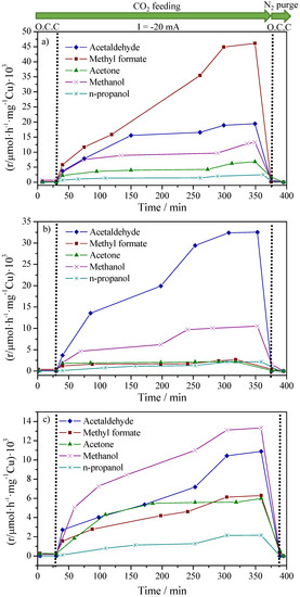 Figure 3 shows the production rates of different compounds as a function of the time on stream during the electroreduction of CO2 at a constant applied current of −20 mA and 90 °C. Note that no products were obtained under open circuit conditions (OCC, no current application). A constant current of −20 mA was subsequently applied at 90 °C for approximately 350 min under the same reaction atmosphere. This polarization was maintained until products were obtained at a steady state rate. During this current application step, hydrogen (not shown in Figure 3, reaction (1)) and different products such as methanol, acetaldehyde, methyl formate, acetone, and n-propanol were obtained by reactions (2)–(6), respectively: