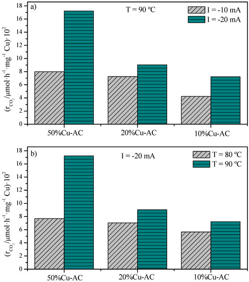 Figure 4a,b summarize the effect of the applied current and the reaction temperature on the steady state CO2 consumption rate (after 350 min of polarization), respectively. The reaction rates were normalized by the amount of Cu deposited on each cathodic-catalyst. In line with the previous experiments, sample 50% Cu-AC showed larger electrocatalytic activities than samples 20% Cu-AC and 10% Cu-AC for all the reaction conditions studied. As expected, the consumption rate of CO2 increased with the applied current, most likely because of an increase in the electrochemical supply of H+. In line with previous studies [15], an increase in the reaction temperature also resulted in higher electrocatalytic activities for all the catalysts tested. While the kinetics of the electrochemical reactions can be improved by increasing the temperature [34], the protonic membrane prevented us from testing the system above 90 °C since its stability and conductivity under appropriate humidity conditions is not ensured at these conditions.