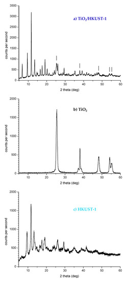The crystal structure of the materials was checked by powder X-ray diffraction (PXRD) analysis (Figure 1). PXRD patterns of TiO2/HKUST-1 sample (Figure 1a) showed the superimposed pattern of HKUST-1 (Figure 1c) [31] and anatase TiO2 diffraction peaks [45] (Figure 1b), corresponding to (101), (004), (200), (105), and (211) reflections highlighted in the figure. In particular, the pattern indicates that HKUST-1 shells in TiO2/HKUST-1 are highly crystalline, as confirmed by transmission electron microscopy (TEM), while pure HKUST-1 contains a greater fraction of amorphous phase.