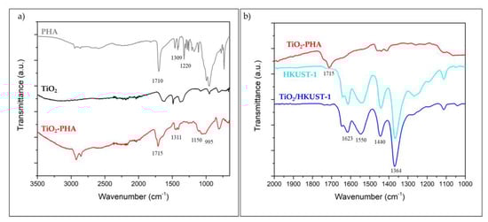 FTIR spectra of: (a) pristine PHA (top, gray line), RE TiO2 NPs (black line) and TiO2-PHA (red line) and (b) TiO2-PHA (red line), HKUST-1 (sky blue line) and TiO2/HKUST-1 (blue line) in the 2000–1000 cm–1 range.