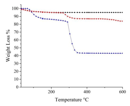 TGA curves of RE TiO2 NPs (black line), TiO2-PHA (red line), and TiO2/HKUST-1 (blue line).