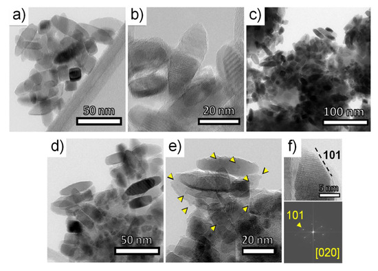RE TiO2 sample exhibits well-formed rhombic elongated nanocrystals with estimated size of 16.5 nm in width and 45–60 nm in length (Table S1 in Supplementary Materials), and with mainly exposed {101} and {010} crystal facets (Figure 4a,b), according to the results reported by Dihn et al. [50].