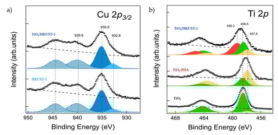 The Cu 2p3/2 XPS spectra of HKUST-1 and TiO2/HKUST-1 (Figure 7a) show peaks with similar lineshapes, suggesting that the copper chemical environment in the hybrid material is analogous to that of pristine HKUST-1. The main peak of Cu 2p3/2 was observed at 935.0 eV and it was deconvoluted into two components at 935.0 eV and 932.8 eV, originating from Cu(II) (blue peak in Figure 7a) and Cu(I) (sky blue peak in Figure 7a). By supposing a homogeneous stoichiometry, XPS indicates that Cu(I) percentage with respect to the total copper amount is ~11% in HKUST-1. This amount increases up to 17% in the final hybrid material [56].