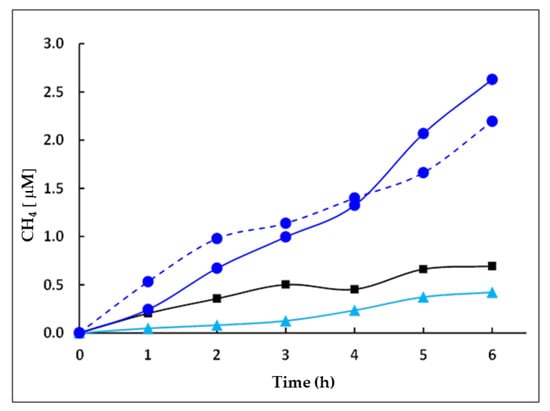 CH4 evolution in the presence of TiO2-PHA (black line), HKUST-1 (sky blue line), TiO2/HKUST-1 first run (dashed blue line) and second run (continuous blue line).