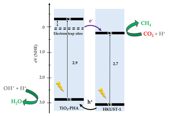 Besides, photogenerated holes can migrate toward the VB of TiO2 and contribute to the water decomposition to OH• and H+ [78]. The whole process highly hinders the electron–hole recombination [79,80], boosting the photoreduction activity of TiO2/HKUST-1.
