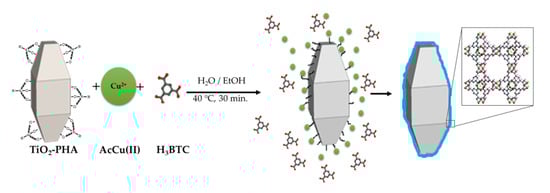 In a typical reaction, a fixed amount of TiO2-PHA (300 mg) was firstly dispersed and sonicated for 10 min in an EtOH/H2O 1:1 solution. Simultaneously, two solutions with the precursors AcCu(II) and H3BTC have been prepared. In the first, 355 mg AcCu(II) were dissolved in 20 mL of EtOH/H2O 1:1 solution at 45 °C, while 222 mg of H3BTC were dispersed in 10 mL of EtOH/H2O to obtain the second solution. After that, the two solutions were mixed with the TiO2-PHA suspension prepared before. The suspension was stirred for 30 min at 45 °C and then the product was collected by centrifugation and the powders were re-dispersed in the EtOH/H2O solution. This suspension was mixed again with the AcCu(II) and H3BTC solutions. The process was repeated three times in order to obtain a material with a higher percentage of MOF. Finally, the TiO2/HKUST-1 powders obtained were washed 3 times with EtOH/H2O 1:1 and dried at 80 °C in an oven for one night.
