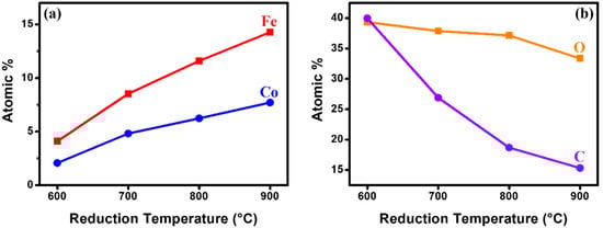 (a) Iron and Cobalt atomic % and (b) Oxygen and Carbon atomic % according to reduction temperature of the Fe–Co/MgO catalyst.