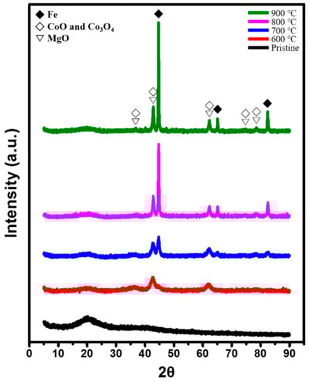 Figure 2 shows the diffraction pattern of elements in the Fe–Co/MgO catalyst reduced at various temperature. The X-ray Diffraction (XRD) peaks clearly present metallic iron (zero-valent iron, JCPDS card No. 00-006-0696), cobalt oxide (JCPDS card No. 01-070-2855) and magnesium oxide (periclase, JCPDS card No. 01-071-1176) phases [26,27,28,29]. All the peaks become narrow and sharpen with increasing reduction temperature. It means that the degree of crystallinity of identified elements are increased as higher reduction temperature [20]. Especially, the peak intensity of iron which is observed at 2θ = 44°, 65°, and 82° is much increased as reduction temperature increases. The XRD peaks of both the cobalt oxide and magnesium oxides appeared at almost the same positions, and it is difficult to distinguish each peak clearly [26,27]. However, the peak intensity of the cobalt oxide becomes high as reduction temperature increases. The size of metallic iron particle within the catalyst is obtained by Scherrer equation analysis [30,31]. According to the calculation, the size of metallic iron particles was 8.2, 16.8, 29.0, and 40.4 nm, respectively, while reduction temperature was increased from 600 to 900 °C. This result can be explained by the fact that the agglomeration of metallic iron atoms in the catalyst is much activated when reduction temperature is higher.