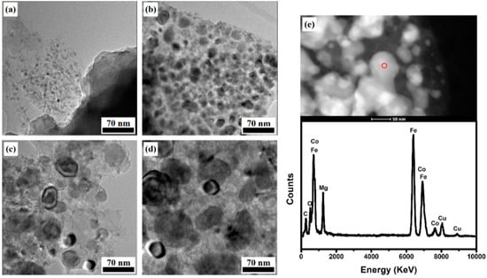 TEM image of catalyst particles reduced at (a) 600, (b) 700, (c) 800 and (d) 900 °C, respectively, and (e) TEM-EDX spectrum on the metallic catalyst (red ring).