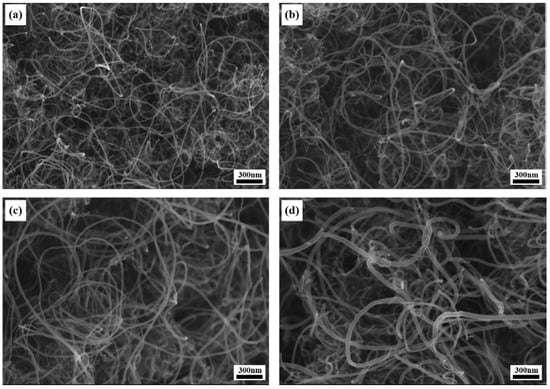 Scanning electron microscope (SEM) image of CNTs grown by using the Fe–Co/MgO catalyst reduced at (a) 600, (b) 700, (c) 800, and (d) 900 °C, respectively.