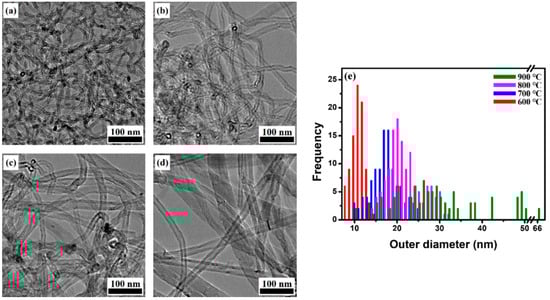 TEM image of the as-synthesized MWNCTs using catalysts reduced at (a) 600, (b) 700, (c) 800, and (d) 900 °C; (e) for histograms of diameter distributions.