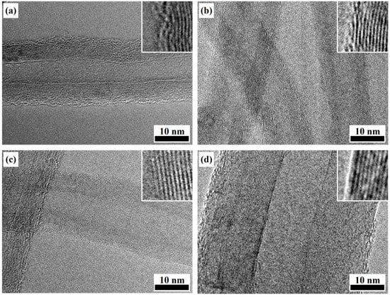 High resolution of TEM images of MWCNT using catalysts reduced at (a) 600, (b) 700, (c) 800, and (d) 900 °C, respectively.