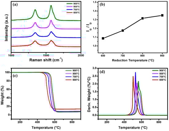 TGA analysis was used to determine the carbon content and purity of as-grown MWCNTs and understand overall crystallinity of MWCNTs. Figure 7c shows a comparative TGA weight loss curve of the as-grown MWCNTs. Purity of as-grown MWCNTs was about 86.5, 92.2, 93.4, and 93.1%, respectively at reduction temperature of 600, 700, 800, and 900 °C and the burn-out temperature of MWCNTs was increased as the reduction temperature increases. The derivative thermogravimetric (DTG) curve also shows that relative crystallinity of MWCNTs becomes higher with increasing reduction temperature as shown in Figure 7d. This result reveals that the higher crystalline metal catalysts induce the higher crystalline CNTs due to better graphitization of graphene sheets.