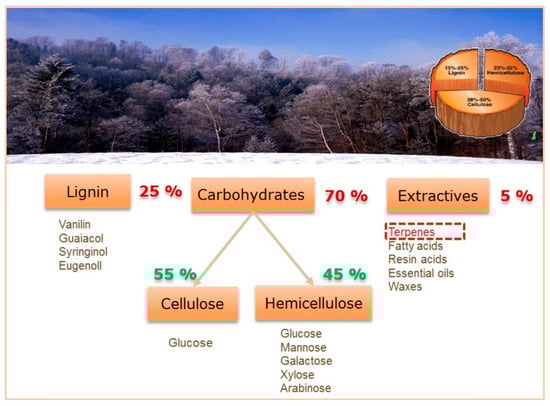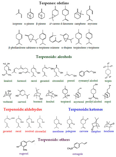 Terpenes are hydrocarbons consisting of isoprene (C5) basic units even if they are structurally very diverse. Terpenes or more precisely monoterpenes (C10), sesquiterpenes (C15), diterpenes (C20), sesterterpenes (C25), triterpenes (C30), and rubber (C5)n can be either branched or cyclic unsaturated molecules. Being typically extracted from the resins of coniferous trees they can be also present as acyclic or mono- to pentacyclic derivatives containing alcoxy, ether, carbonyl, keto, or ester ketone groups (i.e., “terpenoids”). These substrates present in various living species [32], particular in higher plants, are characteristic of a specific plant type.