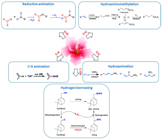 This section is devoted to several reaction routes available to form C–N bonds in the terpenes of interest. Classical approaches for amine synthesis by a direct reaction of ammonia with alkyl halides or alternatively reduction of nitro or nitrile compounds are not considered here, instead the main focus is on hydroamination, hydroaminomethylation, reductive amination, and alcohols coupling with amines [1]. As mentioned above terpenes are highly functionalized molecules that contain double bonds, while their derivatives bear carbonyl and alkoxy or hydroxyl groups (Figure 2) that can be readily involved in various amination strategies.