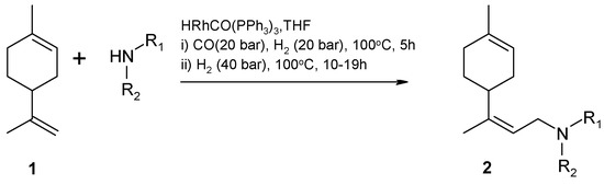 Hydroaminomethylation of limonene (1) with secondary amines, Y—yield of product: 2a—R1 = n-propyl, R2 = H, Y = 85%; 2b—R1 = i-propyl, R2 = H, Y = 50%; 2c—R1 = benzyl, R2 = H, Y = 44%; 2d—R1 = R2 = piperidine, Y = 80%; 2e—R1 = R2 = morpholine, Y = 79%; 2f—R1 = R2 = piperazine, Y = 89%; 2g—R1 = phenyl, R2 = H, Y = 50%. Reprinted from [76] with permission from Elsevier.