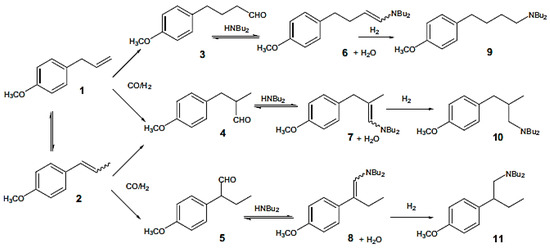 Hydroaminomethylation of estragole (1) (Figure 13), a bio-renewable starting material, with di-n-butylamine was studied in [80]. Estragole being a primary constituent of essential oil of tarragon (60–75%) is also present in other sources, such as pine oil, turpentine, fennel or anise (2%) [86]. HAM consists of alkene hydroformylation followed by reductive amination of aldehydes. Different ligands were used with rhodium(I) catalysts including phosphine, phosphites, and phospholes. The latter were the most efficient not only in hydroformylation, but also in reductive amination. Three isomeric amines (9–11) were generated as final products (Figure 13). Along with these imines aldehydes (3–5) and enamines (6–8) were observed depending on conditions. Side reactions included for example aldol condensation. Some other hydrogenation products as well as unidentified products were also formed.