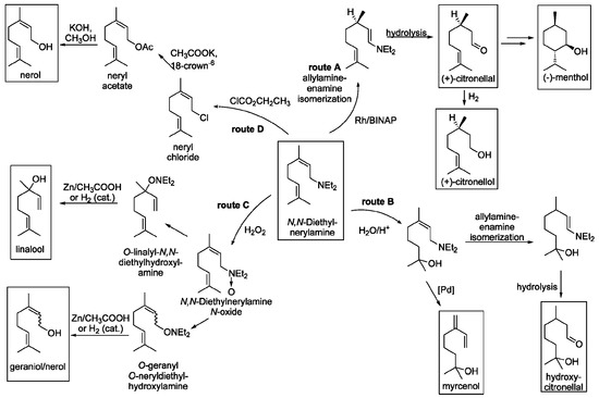 N,N-Diethylgeranyl- and nerylamine are valuable starting compounds for synthesis of a variety of terpenoids (Figure 17) including (−)-menthol, myrcenol, hydroxycitronellol, nerol, geraniol, linalool, (+)-citronellal, and (+)-citronellol.