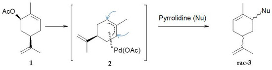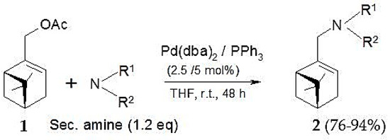 In order to address the role of solid catalysts in the amination of terpenes it was important to have an overview first of the same reactions occurring with the homogeneous counterparts. Such reactions can be considered as benchmarks, which solid catalysts should match. It should be mentioned in this connection, that it was recognized many years ago that at molecular level, there is little to distinguish between homogeneous and heterogeneous catalysis, while there are clear distinctions at the industrial level [31].