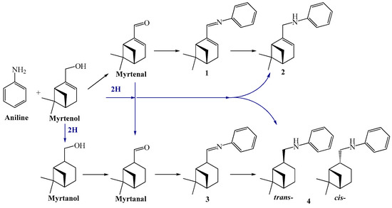 The desired amine (3) reacted also with the aldehyde 2 resulting in formation of secondary and tertiary amines. Moreover, limonene (1) underwent isomerization to its isomer isoterpinolene (4) [25,77].