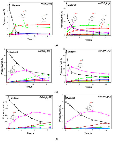 - Demidova, Y.S.; Simakova, I.L.; Estrada, M.; Beloshapkin, S.; Suslov, E.V.; Korchagina, D.V.; Volcho, K.P.; Salakhutdinov, N.F.; Simakov, A.V.; Murzin, D.Y. One-pot myrtenol amination over Au nanoparticles supported on different metal oxides. Appl. Catal. A Gen. 2013, 464–465, 348–356. [Google Scholar] [CrossRef]