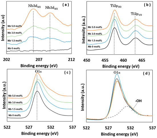 High-resolution (a) Nb 3d, (b) Ti 2p, and (c) O 1s X-ray photoelectron spectroscopy (XPS) spectra of TiO2 with varying Nb contents. (d) O 1s spectral fitting, revealing the presence of peaks related to OH groups.