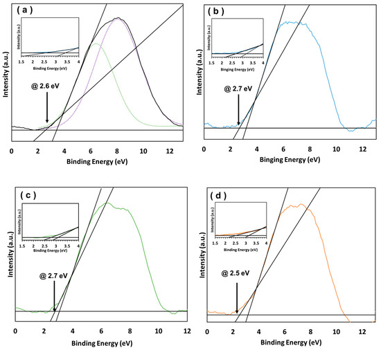 XPS spectra and valence-band maxima of the Nb-doped TiO2 with Nb contents of (a) 0, (b) 1.5, (c) 3.0 mol %, and (d) 5.0 mol %. The Gaussian fitted electron emissions from the π (green) and σ (purple) O 2p orbitals are also shown in (a).