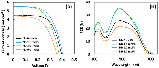 Figure 4b reveals that the device containing the 1.5 mol % Nb-doped TiO2 electrode exhibits enhanced IPCE compared to that of the undoped electrode. Indeed, the absorption edge was observed to shift from 730 nm to 750 nm. Nb has been reported to create oxygen vacancies in TiO2 that act as active sites, resulting in a photoresponse red shift [25]. However, the lowest IPCE was obtained in the device containing the 5.0 mol % Nb-doped TiO2 electrode, as revealed by the J-V curves.