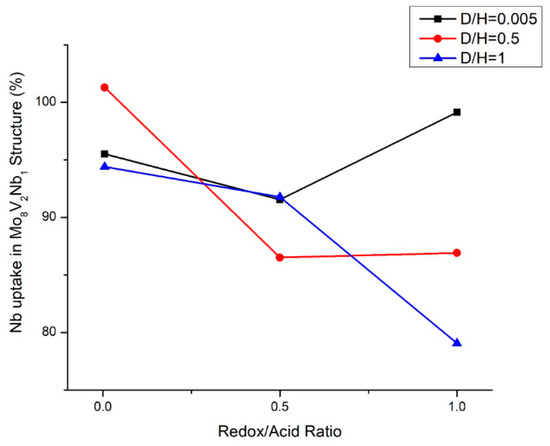 The hydrothermal synthesis method employed here proceeds through the formation of an Anderson-type heteromolybdate intermediate for which the possibility of incomplete element uptake exists [26,27,45]. Variation in elemental composition over the design space was accomplished by varying the R/A and the D/H ratio. Energy Dispersive X-ray Spectroscopy (EDS) was used to probe both intended and unintended variation in the loadings of catalyst components. Analysis of the EDS data was focused on perturbations to the base structure as evidenced by the measured vanadium and niobium contents. It should be noted that nominal loadings for the 81 catalysts were expected to fall in the following compositional range: Mo8V2Nb1R0.000025-0.5A0.0025-1. Over the 81 samples studied, atomic loadings for the Mo8V2Nb1 base composition were found to range from 1.28 ± 0.1 to 3.33 ± 0.84 for vanadium, and 0.69 ± 0.12 to 1.17 ± 0.05 for niobium. While some of this variance can be ascribed to an EDS measurement error, certain relationships between the base catalyst uptake and the catalyst design variables were found to be statistically significant. For instance, uptake of both vanadium and niobium into the structure were negatively correlated with an increased D/H ratio, meaning that, to some extent, the dopants displaced the V and Nb from the material. It should be noted that this effect was more pronounced in the case of Nb, with Nb uptake being almost 10% less when D/H was increased from 0.005 to 1. This effect was also much more significant when the elements being doped were primarily redox elements (i.e., high R/A ratio), as shown in Figure 1. This suggests that the redox elements were able to displace the niobium in part from the channels of the base structure.