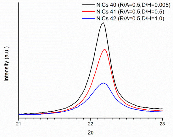 The final structural descriptor studied via XRD analysis was the formation and relative volume of secondary phases. This variable is important in understanding trends in activity due to its direct relation to the abundance of the active Mo-V-O phase. This will be defined as the secondary-phase intensity ratio (SPIR); the XRD intensity ratio between the largest secondary phase peak and the largest Mo-V-O primary phase peak was at 22° 2θ. While the doped redox element, particularly when the element was Pd, affected the occurrence of secondary phases, it had no significant effect on the SPIR. The SPIR was found to be mostly sensitive to the type of acid/base element doped as well as the R/A and D/H ratios. Specifically, it was found that doping with Cs at an R/A level of 0.005 yielded the highest SPIRs, and this effect was increasingly apparent at higher D/H ratios. The effect of increased SPIR with decreased R/A ratio and increased D/H ratio held for other redox–acid/base pairings as well, but at a much smaller magnitude. The effect of secondary-phase formation when Cs was doped is illustrated in Figure 5.