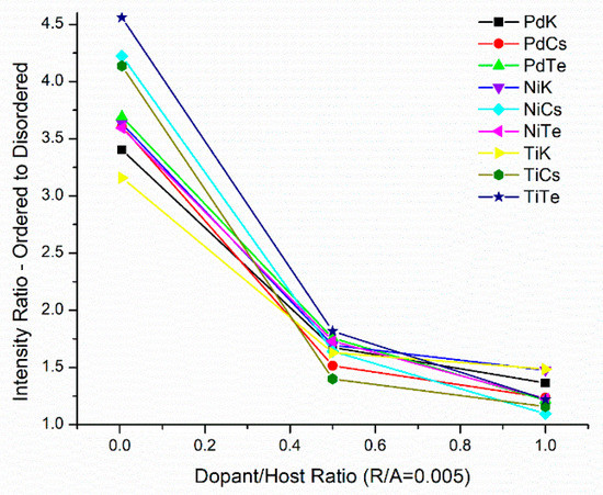 Additionally, some sensitivity was found in terms of Nb and V uptake with respect to the specific redox and acid elements doped. The V uptake was found to be particularly sensitive to the doping of redox elements, being the lowest when Pd was doped, while the Nb uptake was sensitive to both redox and acid doping, with the lowest uptakes corresponding to Ti and Te doping. In general, the least amount of disturbance to the base structure was achieved when balanced levels of redox and acid elements were doped (R/A = 1), and the greatest amount of disturbance was found at the highest doping levels (D/H = 1). Additionally, an interaction between the R/A ratio and D/H ratio was observed where increasing the D/H ratio only caused significant changes to the base structure for high levels of redox element loading (R/A = 1). This indicates that acid/base elements were more easily incorporated into the base structure than redox elements. Overall, it was found that increasing or decreasing D/H and R/A ratios yielded the intended variations in dopant loadings.