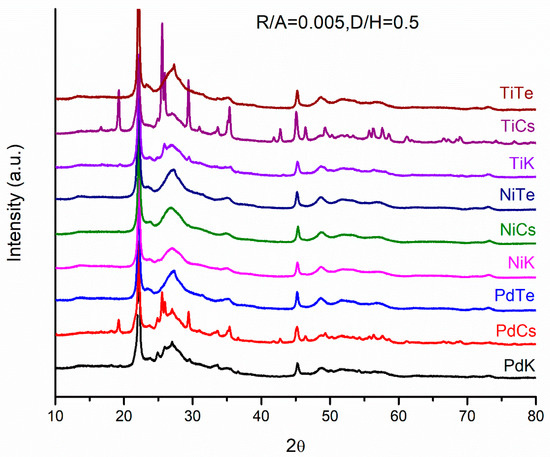 The grain sizes calculated via Scherrer’s equation from the FWHM of 22° peak of the doped MoVNb samples were found to be sensitive to both the type of dopants and the levels studied. These parameters were investigated to understand how different doping levels could change the active surface area and/or redox properties of the catalysts; effects which may be expected to accompany a change in Mo-V-O grain size. The grain size of the base MoVNb material, calculated using the broadening of the 22° peak according to Scherrer’s equation [48,49], was 22 nm. Identical analysis of the doped MoVNb catalysts showed that the range of grain sizes was 12.4–35.0 nm, depending on the design levels employed. Statistical analysis of the relationship between doping elements and levels with grain size revealed that the most important factors for controlling grain size were the type of redox element and the D/H ratio, as well as the interaction between the two. It was found that doping with Ni increased grain size most significantly, while Ti yielded grain sizes that were smaller and, on average, identical to that of the base MoVNb oxide. In general, increasing dopant levels had the effect of decreasing grain sizes, but at the lowest level of D/H = 0.005, no notable difference could be seen between the grain sizes when Pd, Ni, or Ti was doped. In an analogous manner, differences between grain sizes of Pd-, Ni-, and Ti-doped materials were only apparent at R/A ratios of 0.5 or greater. These interactions simply indicate that the different behavior of redox elements with respect to grain size were not apparent under the conditions where the redox elements were doped in the smallest amounts (i.e., small D/H and R/A ratios). The observation of decreased grain sizes at higher dopant levels, as can be seen for the MoVNbNiCs family of catalysts at the R/A = 0.5 level in Figure 3, leads to the question of whether one of the effects of the redox dopant is to impede the crystal growth of the primary mixed-oxide phase.