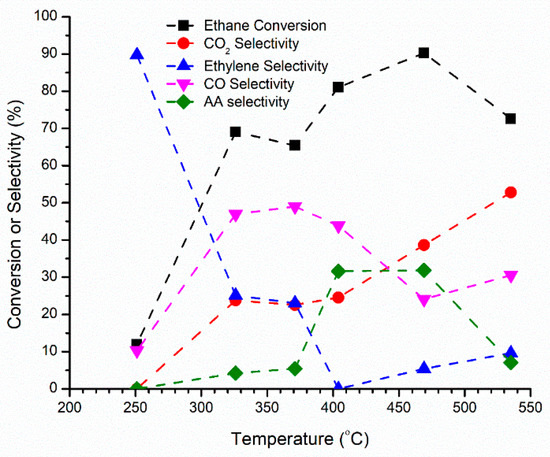 Ethane partial oxidation tests were performed using an ethane to oxygen ratio of 4:5 [16,50] (40% ethane, 50% oxygen, 10% nitrogen). Onstream results were analyzed with a Shimadzu Gas Chromatograph GC2014 (Kyoto, Japan), equipped with a thermal conductivity detector (TCD) to analyze the product distribution. The experiments were carried out in a quartz tube plug flow reactor at ambient pressure, where the space velocity was kept at a constant 1200 h−1. Catalysts were sieved between 45 and 60 mesh size to mitigate a pressure drop. The catalysts were used as synthesized and a temperature ramp in the range of 120–460 °C was used with an initial 10 °C/min ramp rate from room temperature to 120 °C, and a subsequent 30 °C step size (1.5 °C/min rate) for each catalyst was applied. Temperature measurements were taken inside the catalyst bed using an insulated K-type thermocouple.