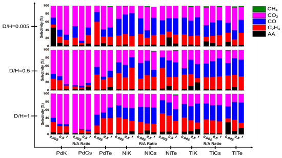 A low R/A ratio of 0.005 was found to be favorable for both ethylene and acetic acid selectivity, indicating that in both cases an excess of acid/base dopant is needed relative to the redox dopant. This is consistent with the literature, where the incorporation of acid/base elements at an atomic ratio of ~2:1 between V and the acid/base element has been shown to result in the increased formation of value-added products in partial oxidation reactions [13,15,38]. Surface acidity is thought to play a large role in product selectivity, where acid sites promote the formation and subsequent desorption of acetic acid, while ethylene preferentially forms and desorbs on reducible sites [9,50], such as those found on the redox elements. However, in this case, it was found that acid sites were also necessary for the formation of ethylene. The role of surface acidity also extends to other catalytic systems for the conversion of ethane into value-added products, where in the oxidative dehydrogenation of ethane, the inclusion of highly basic metals such as platinum leads to increased selectivity towards ethylene [4,6]. It is well-known that dopant effects can considerably affect catalytic activity when doping with transition metals due to the electronic interactions between the metals and the host oxide structure [6,8,12,17,22,31].