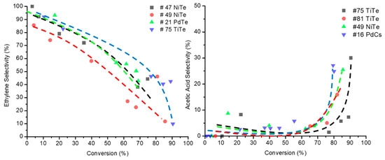 Ethylene and acetic acid selectivity vs. conversion for all samples at 450 °C.
