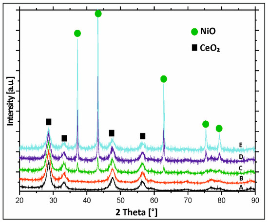 The analysis of the diffraction curves recorded for monometallic nickel supported catalysts calcined in air for 4 h at 400 °C showed the presence of only NiO and CeO2 phases, independently of the nickel content (see Figure 3). This is supported in published studies [51,52]. Ahmed et al. [33] studied the phase composition of as prepared CeO2–Al2O3 binary oxide and mono-oxides such as: CeO2 and Al2O3 supports calcined in air at 550 °C. They reported the presence of θ-Al2O3 phase, γ-Al2O3, and crystalline CeO2 cubic fluorite structure phases for the investigated supports.