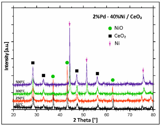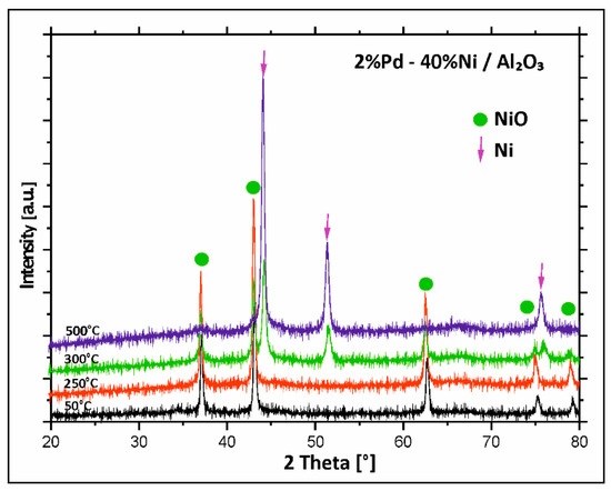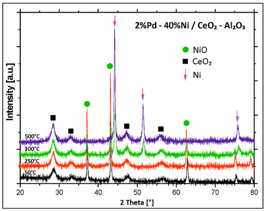 To study the changes of the phase composition during the activation process performed before the catalytic tests and to explain the reduction behaviour of the mono- and bimetallic catalysts supported on binary oxide, in situ XRD measurements in a mixture of 5%H2–95%Ar were carried out in the temperature range of 50–500 °C for bimetallic catalysts supported on mono Al2O3, CeO2, and binary oxide CeO2–Al2O3. Bimetallic Pd–Ni/CeO2 catalyst was first tested. Results are given in Figure 4. The analysis of the diffraction curves recorded for bimetallic Pd–Ni catalyst supported on CeO2 showed that from 50 °C to 250 °C the diffraction curves showed only NiO and CeO2 phases. Increase in the reduction temperature above 250 °C results in disappearance of the NiO phase. The X-ray Powder Diffraction (XRD) pattern recorded at 300 °C for Pd–Ni/CeO2 catalyst showed the diffraction peaks of metallic nickel and CeO2 phases. Further increase in the reduction temperature above 300 °C caused the appearance of CeO2 and metallic nickel phases in the diffraction curves. In the next step of the XRD, in situ measurements, Pd–Ni/Al2O3 bimetallic supported catalysts were studied and the diffraction curves obtained in the investigated temperature range are presented in Figure 5.